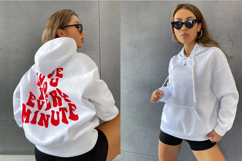 La primera propuesta de esta marca es una sudadera con capucha. Esta prenda cuenta con un estampado en la parte trasera, siguiendo la moda actual. Este diseño está disponible en multitud de colores: blanco, negro, verde mente, albaricoque, celeste y marrón chocolate. La frase significa "Te quiero cada minuto". Shein la tiene a la venta por tan solo 11 euros. Veamos más novedades de esta firma...