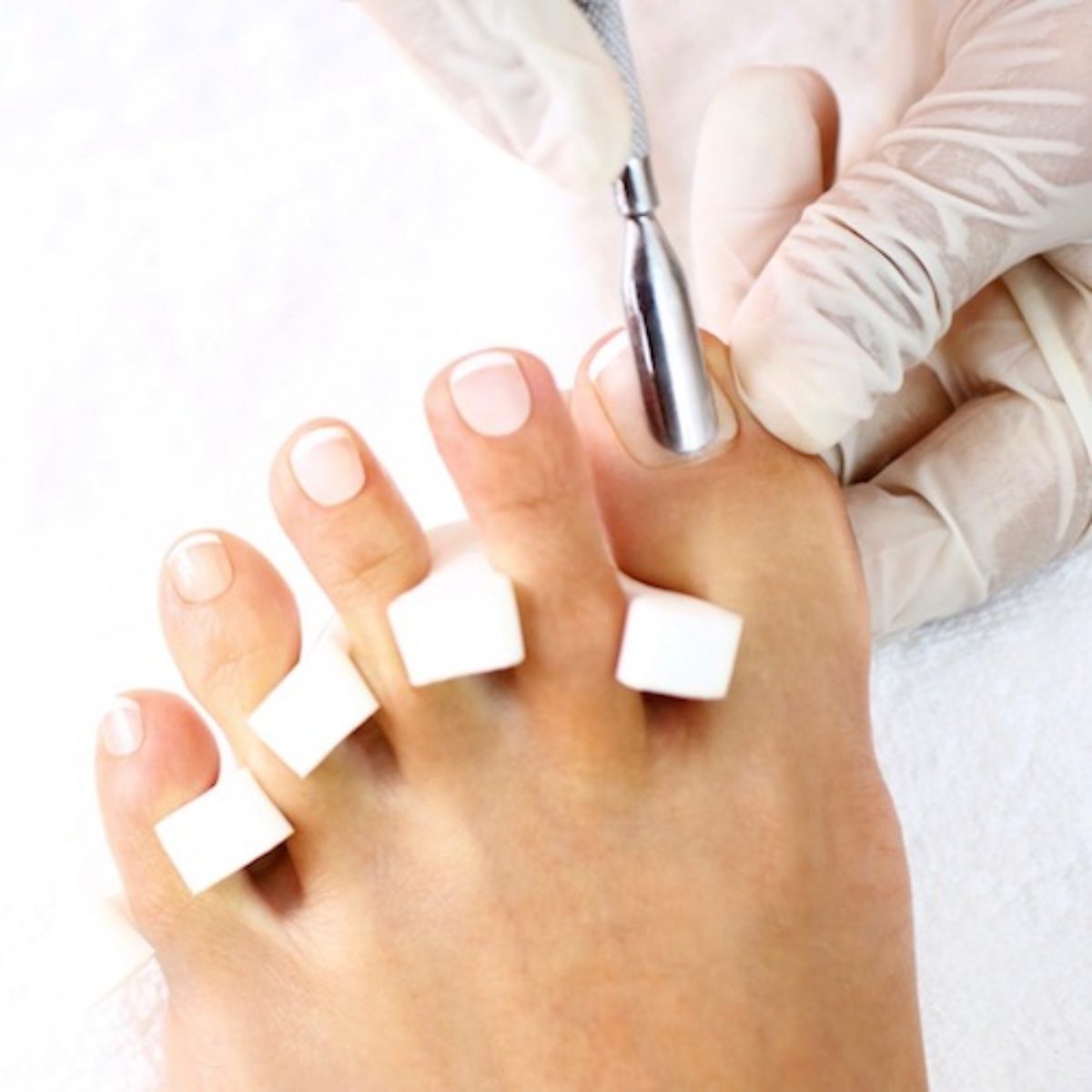 Closeup of pedicure specialist creating beautiful toenails. Shot over white background.