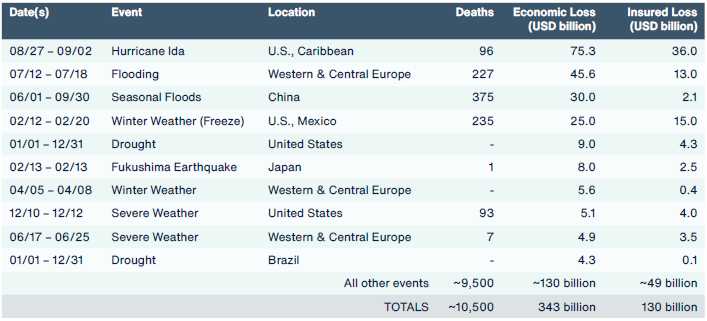 El informe revela un total de 343.000 millones de dólares en pérdidas económicas en 2021, de los cuales 329.000 millones se debieron a fenómenos meteorológicos y climáticos, lo que convierte al año pasado en el tercero más costoso del que se tiene constancia una vez ajustada la inflación. Aunque las pérdidas aumentaron con respecto a 2020, el número de catástrofes notables disminuyó ligeramente, lo que demuestra el aumento del coste y la gravedad de estos sucesos. De los siniestros de 2021, sólo el 38% estaban cubiertos por el seguro. A pesar del aumento de las pérdidas globales con respecto a 2020, la brecha de protección de las pérdidas económicas no cubiertas por el seguro disminuyó del 63% al 62% en 2021.