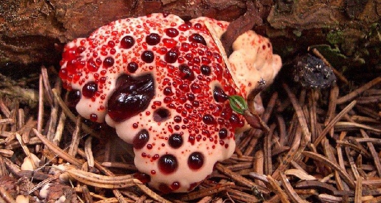 Aquí, en esta imagen, la naturaleza nos muestra un poco de su lado terrorífico. Es indudable, que el líquido que parece brotar de ese hongo de tamaño gigante, parece sangre. Nos preguntamos por qué tiene esa apariencia. Definitivamente puede ser sangre, quizá de un animal que murió en la cercanía, o de un animal que murió al probar el dicho hongo. No lo sabemos, pero la imagen terrorífica, y la extraña procedencia de ese líquido espeso y rojizo, nos genera dudas sobre la bondad de la naturaleza.