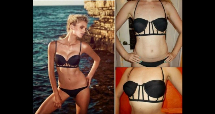La chica de la fotografía creía que iba a lucir un bikini de lo más original en verano y se encontró con este bikini chino que no tenía por donde cogerlo, ¡Si hasta las copas estaban al revés! Vamos, que el bikini fue enterrado en el baúl de los recuerdos para siempre, o eso es al menos lo que haría yo.