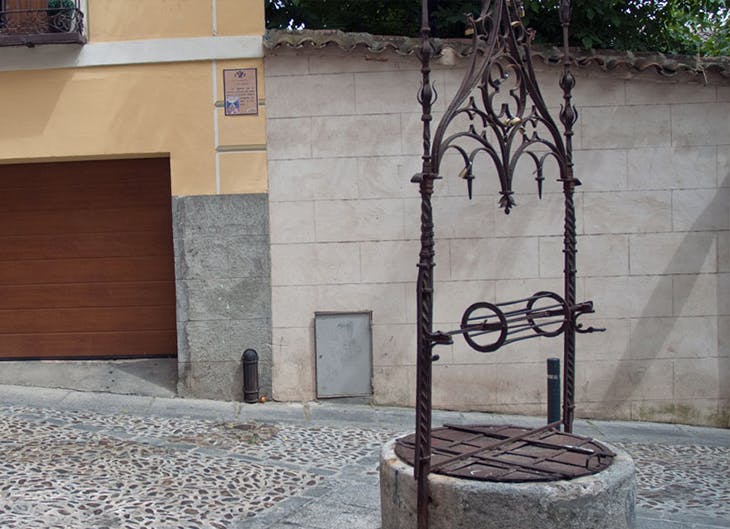 Cuenta esta leyenda de España la historia de Raquel, la hija del rabino y Fernando, un joven cristiano, quienes en secreto se ven todas las noches en los jardines del pozo. Pero fueron vistos por un amigo y avisa al padre quien lo mata clavándole una espada, llorándole todas las noches, lleno con sus lágrimas el pozo y tras creer verlo en el fondo se arrojó dentro de él.