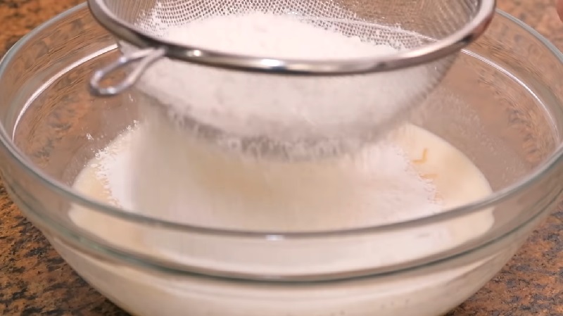 El siguiente paso es tamizar la harina y la levadura a la hora de añadirla a la mezcla. Pásala con un colador para que no te salga ningún grumo en el bizcocho de leche condensada. De esta manera, te va a quedar mucho más esponjoso que si no lo tamizas. No te cuesta nada agitar el colador para que la harina se vaya filtrando. Ya estamos en la recta final de la receta...
