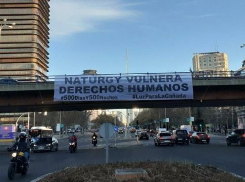 "Naturgy vulnera derechos humanos", reza la pancarta colocada en el céntrico Paseo de la Castellana, junto con las etiquetas '#LuzParaLaCañada' y '#500DíasY500Noches', en alusión al año y cuatro meses que llevan sin luz unos 4.000 vecinos de los sectores V y VI de la Cañada Real Galiana, 1.800 de ellos niños y niñas.