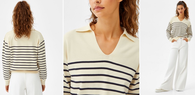 Como puedes comprobar, las rayas están de moda esta temporada, por lo que impregnan todo tipo de prendas. En este caso, nos encontramos de un jersey de color blanco crudo con franjas horizontales azules. Cuenta con un cuello típico de los polos, es decir, con solapas que sobresalen. Puedes adquirirlo en las tiendas de Bershka, en su web o en su app por solo 25'99 euros.