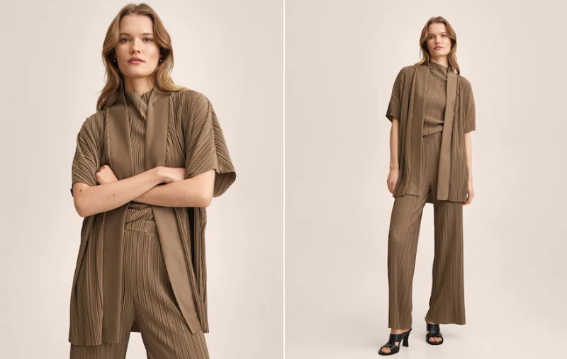 Otro estilo más arriesgado es este caftán de color marrón. Se trata de una prenda plisada, es decir, que tiene dobleces verticales por toda su extensión. Podrás comprar un pantalón a juego. La chaqueta es de manga tres cuartos y no tiene cierre, por lo que quedará al descubierto lo que lleves debajo. También está disponible en color negro. Puedes comprarlo en las tiendas de Mango por 29'99 euros.