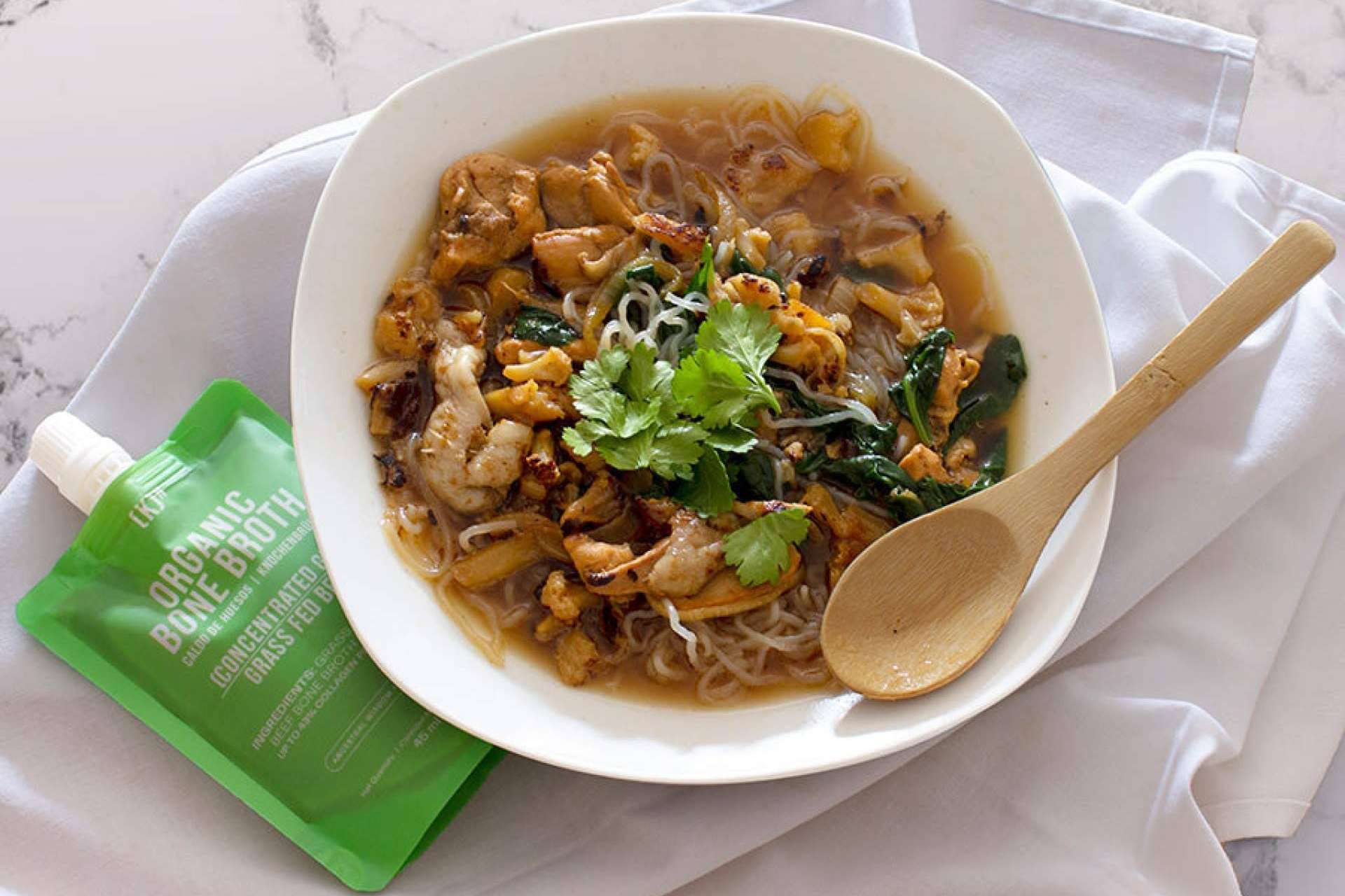 Los huesos de ganado ecológico se cuecen en agua durante un mínimo de 24 horas, agregando algún elemento ácido, como vinagre de sidra de manzana o jugo de limón, para extraer todos los aminoácidos. Además, se añaden especias y hortalizas como cúrcuma, jengibre, zanahoria y cebolla. Por último, se filtra y refrigera para crear un caldo gelatinoso, sabroso y saludable.