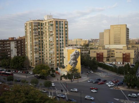 Este mural, pintado durante los últimos tres días de febrero cerca del antiguo Hospital La Fe de València, tiene como figura central una enorme nube de humo como la que podría generar un bombardeo en un contexto bélico y en sus márgenes se puede leer la frase 'La guerra comienza aquí'.