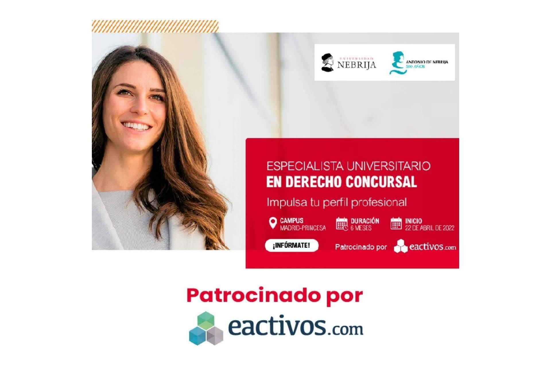 De esta manera, Eactivos.com afianza su relación con la universidad que, actualmente, ocupa la 5 posición entre las 20 mejores universidades de España según un estudio realizado por la revista Forbes: la Universidad de Nebrija. De su mano, patrocina el título de Especialista Universitario en Derecho Concursal que dará comienzo el próximo 22 de abril y que tendrá una duración de 6 meses. Está dirigido tanto a abogados recién habilitados para el ejercicio como a profesionales en ejercicio con conocimientos en materia mercantil o contractual, así como abogados y economistas especialistas en la práctica del derecho concursal.