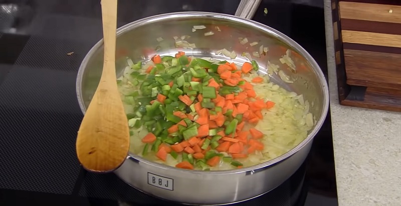 Cuando la cebolla haya "sudado", es decir, que se haya vuelto transparente, podrás añadirle el pimiento verde troceado y las dos zanahorias cortadas en dados pequeños. Remuévelos para que se mezclen todas las verduras. Arguiñano también le echa un apio, aunque este ingrediente es opcional. Deja que se rehoguen durante unos minutos y agrégale una pizca de sal.