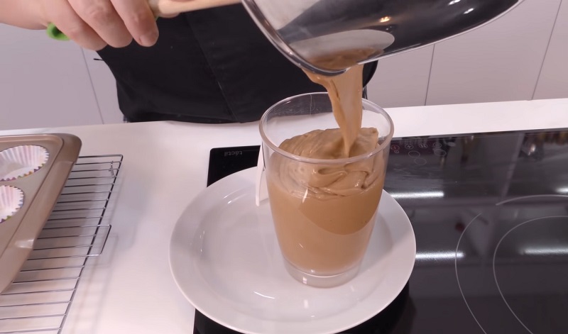 Vete añadiendo la harina mezclada y tamizada poco a poco para que no le cueste integrarse en la mezcla. De esta forma, la masa de las magdalenas de café te va a quedar mucho más esponjosa. Bátela hasta que adquiera una textura cremosa como la que puedes apreciar en la imagen. El color marrón se ha intensificado a medida que bates el conjunto.