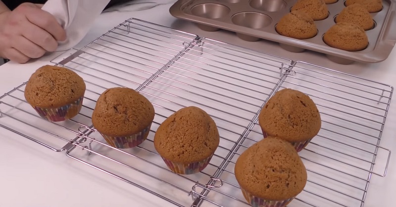 Una vez que saques las magdalenas de café del horno, ponlas sobre una rejilla. Si las dejas en la bandeja con el calor que emana, es probable que acaben húmedas y se te echen a perder. Ten cuidado de no quemarte al cogerlas, ya que van a estar muy calientes. Déjalas reposar cinco minutos antes de hincarles el diente. Puedes ponerle pepitas de chocolate o trozos de nuez por encima como decoración.