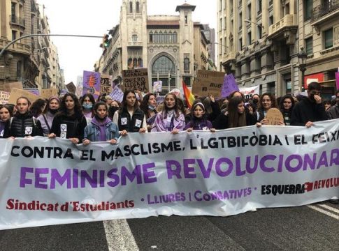 Unos 3.500 estudiantes, según la Guàrdia Urbana, se han manifestado el mediodía de este martes por el centro de Barcelona con motivo del Día Internacional de la Mujer, convocados por el Sindicat d'Estudiants, Lliures i Combatives y Esquerra Revolucionària.