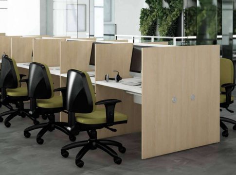 Teniendo en cuenta las necesidades de cada equipo laboral, Office Deco cuenta con tres series de mobiliario para oficinas de atención telefónica, completamente adaptables y versátiles. La línea básica dispone de cubículos individuales, para los cuales se puede elegir entre la variedad de maderas para unificar el espacio de los escritorios. Y además, las sillas son de respaldo permanente que pueden variar en color.