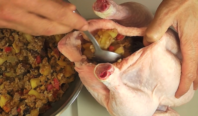 El pollo asado es un plato que le gusta a casi todo el mundo. Este animal tiene una carne muy jugosa y además no aporta muchas calorías. Pero puedes completar esta receta rellenándolo con ingredientes que le van muy bien. Aunque este plato se suele realizar en fiestas, puedes hacerlo para sorprender a tus invitados o para un comida o cena especial.
