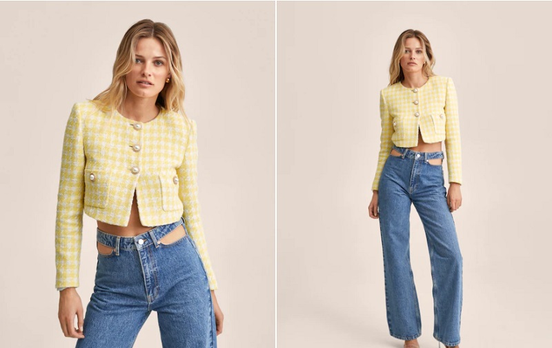 La chaqueta a juego con la falda no tienes por qué llevarla siempre juntas. Esta prenda combina a la perfección con unos vaqueros. Presenta un cierre de botones en su parte delantera y también cuenta con un par de bolsillos. La chaqueta es corta, por lo que parte de tu cintura se va a quedar al aire. Puedes comprarla en las tiendas de Mango, en su página web o app por 59'99 euros.