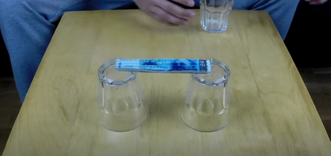 El mago colocará una moneda que puede ser incluso más grande sin que esta se caiga. Toma el billete y lo dobla de forma horizontal formando una M, finalmente, coloca el billete doblado entre los vasos; coloca una moneda sobre el billete y este no se caerá.