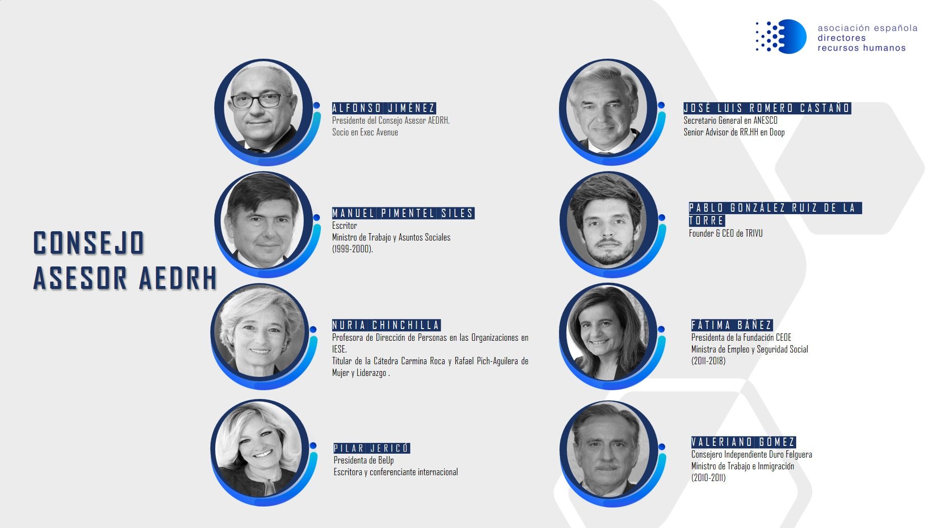 Un consejo asesor que será capitaneado por Alfonso Jiménez, que además de presidente del Consejo Asesor de la AEDRH, es socio de Exec Avenue. Otro de los integrantes del órgano consultivo es José Luis Romero Castaño, Secretario General en ANESCO y Senior Advisor de RRHH en Doop, con un amplísimo bagaje en la empresa tras haber sido director de RRHH de multinacionales como Heineken, Iberia, Sanitas o El Corte Inglés. Completan el consejo dos mujeres de reconocido prestigio como son Pilar Jericó, Presidenta de BeUp, además de escritora y conferenciante internacional y Premio Nacional de Management y Nuria Chinchilla, Profesora de Dirección de Personas en las Organizaciones en IESE y Titular de la Cátedra Carmina Roca y Rafael Pich-Aguilera de Mujer y Liderazgo. Así como Pablo González Ruiz de la Torre, Fundador y CEO de TRIVU, reconocido por Forbes entre los 30UNDER30 y miembro también del Consejo Asesor de AED.