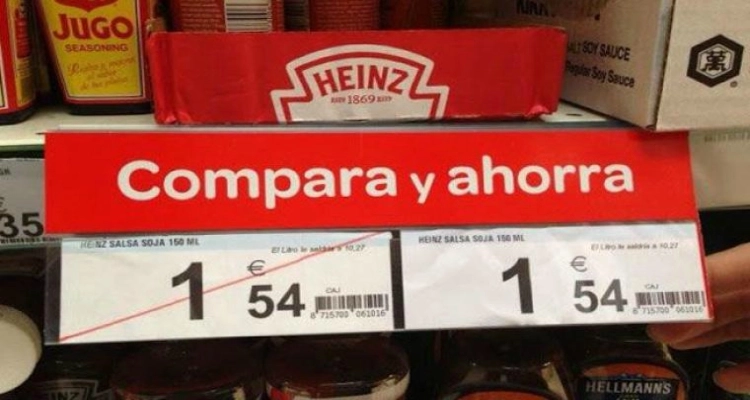'Compara y ahorra' es el título del cartel que anuncia la salsa de soja de la marca Heinz, pero, ¿Qué hay que comparar? ¿El precio? Antes costaba 1,54 euros y ahora..., 1,54 euros. Realmente no sabemos donde está el ahorro en esta ocasión. ¿Será el ahorro misterioso? ¿Al pasar por caja el precio cambiará?