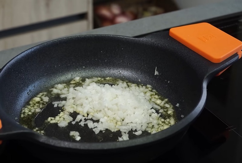 El caldo de pescado se tiene que cocer durante 20 minutos a fuego medio con la tapa puesta. Mientras tanto, coloca una sartén en el fuego y échale un poco de aceite de oliva para que se caliente. En lo que coge temperatura, pica un diente de ajo y añádeselo. También tienes que cortar una cebolla e incorporarla al recipiente. Esta va a ser la base del relleno de la merluza...