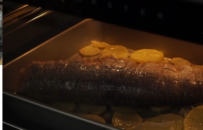 Antes de meterla en el horno, salpimenta su piel si no lo has hecho antes. También tienes que echarle un chorro de aceite de oliva para que no se seque. Por último, viértele un cazo del caldo de pescado por encima. Entonces, ya puedes introducir la bandeja en el electrodoméstico. La merluza rellena se tiene que hornear durante 35 minutos aproximadamente a 180 grados con calor arriba y abajo.