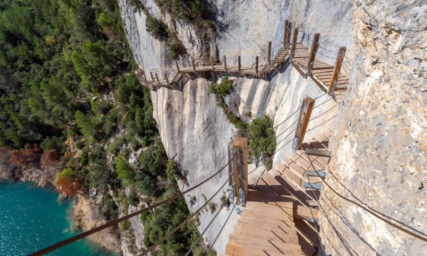 Teniendo que cruzar paredes vertiginosas, puentes colgantes y senderos en cañones, se encuentra este paisaje de España, entre Huesca y Lleida, que cuenta con 8,43 kilómetros de trayecto, por diferentes pasarelas con escalones encajados en la roca, estrechos, cruza los tres tramos que lo componen.