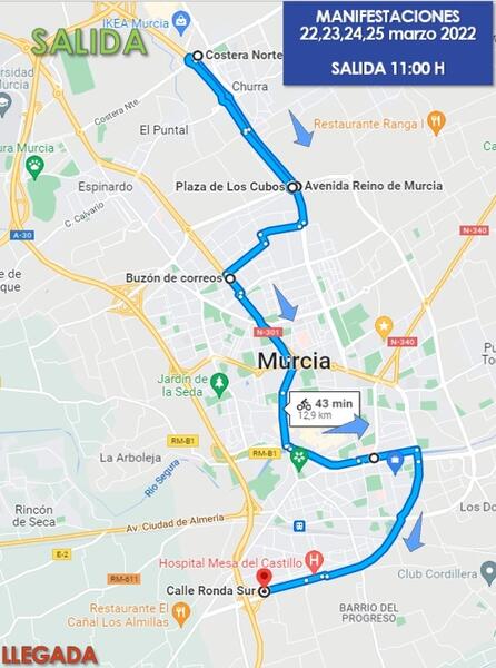 La movilización tenía prevista su partida desde las 11.00 horas desde los aledaños de la zona comercial de Nueva Condomina para llegar a la ciudad de Murcia por la avenida Juan de Borbón, Juan Carlos I, Gran Vía, Teniente Flomesta, barrio de Vistabella y abandonar la ciudad por Ronda Sur.