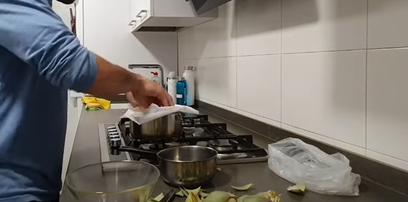 Para evitar que las alcachofas salgan a la superficie mientras se confitan, puedes colocar un papel de horno doblado por encima. De esta manera, va a hacer como una especie de vacío que va a impedir que los vegetales floten. Enciende el fuego y deja que se confiten a la mínima potencia durante al menos 40 minutos. Todavía queda la recta final de esta receta...