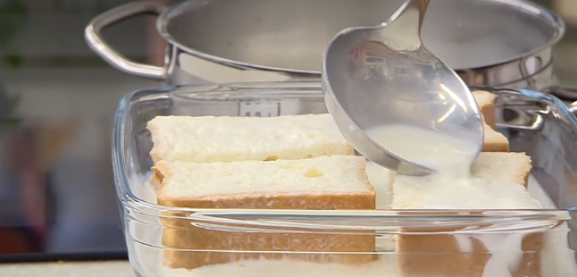 Una vez que la leche esté lista, vierte con cuidado en la fuente y deja que las rebanadas de pan le absorban por completo. Dales un tiempo prudencial para que absorban la mayor cantidad de leche posible para que queden bien impregnadas.