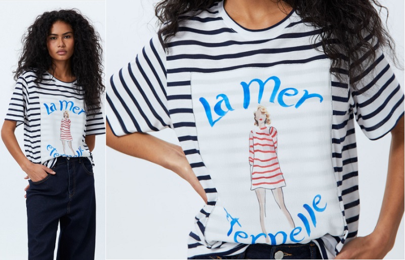 Continuando con la misma línea, nos encontramos con esta camiseta de rayas azules sobre fondo blanco. Cuenta con un estampado de una mujer que lleva un vestido a rayas y alrededor la frase en francés "La mer Terpelle". Es ideal para ponértela en tu día a día como para una ocasión algo más especial. Parfois la ha puesto a la venta por 17'99 euros.