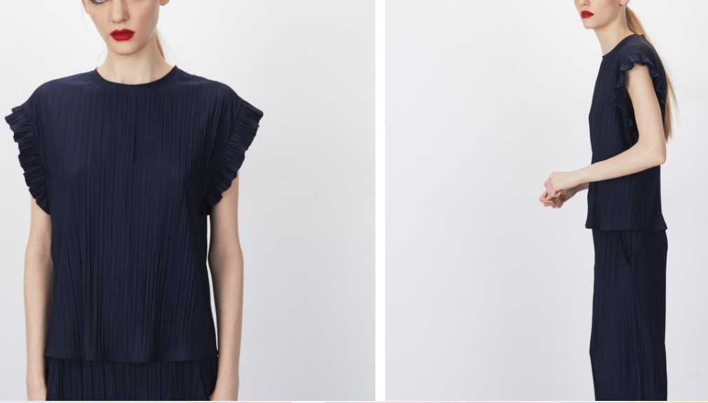 Cambiando de estilo, nos encontramos con esta camiseta plisada. Esto quiere decir que cuenta con arrugas verticales por toda la prenda. Cuenta con cuello caja y una manga corta con detalle de volantes. Está disponible en multitud de colores: azul marino, amarillo oscuro, rosa medio y blanco crudo. Puedes adquirirlo en las tiendas de Parfois o en su página web por apenas 9'99 euros.