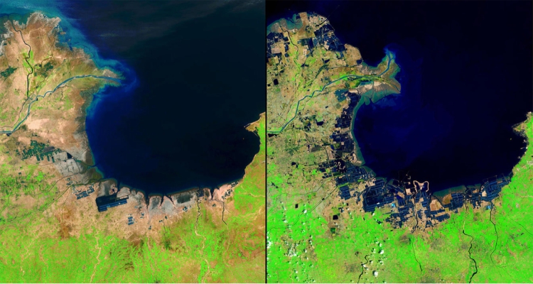 La fotografía de la izquierda fue tomada en el año 1985, mientras que la fotografía de la derecha ha sido tomada en el año 2014. Una auténtica barbaridad, ¿No creéis? Si sigue así desaparecerá la desembocadura actual de río y se hará mucho más grande. Las ciudades y poblaciones próximas podrían desaparecer.