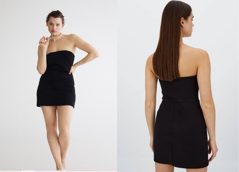 Como puedes comprobar, el negro es el protagonista de la mayoría de diseños de esta marca. En este caso, se trata de un vestido corto con un corsé de punto. Presenta un escote recto tipo palabra de honor y no tiene tirantes. Por lo que tendrás que probártelo para comprobar que te sienta bien. Stradivarius lo tiene a la venta por 19'99 euros.