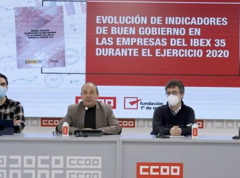 Estas han sido algunas de las conclusiones del informe 'Evolución Indicadores de buen Gobierno en las empresas del Ibex 35 durante el ejercicio 2020', presentado este viernes por Comisiones Obreras, elaborado por Luis de la Fuente, Alicia Martínez y Jesús Cruces, de la Fundación 1º de Mayo, en colaboración con el equipo confederal de CCOO, encabezado por Mario Enrique Sánchez.