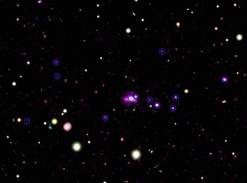 Para buscar agujeros negros en crecimiento, un equipo de investigadores lo observó durante más de ocho días con Chandra.La mayoría de las "manchas" en una imagen óptica del telescopio Hubble son galaxias en el protocúmulo, incluidas 14 que se han detectado en la nueva imagen profunda de Chandra.