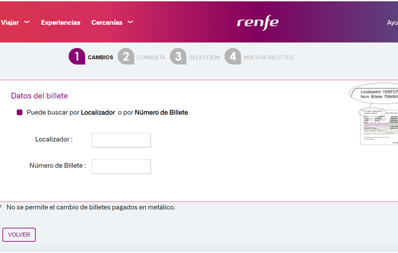 Encontrar esta categoría era la principal dificultad para hacer la solicitud. Una vez dentro, en esta pantalla tienes que acceder a otra vez a solicitar indemnización. En este paso se abre una ventana en la que deberás completar los datos del número de billete, origen y destino. Dependiendo de tu caso al localizar el viaje te saldrá la indemnización que puedes solicitar.