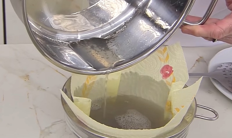 Los berberechos habrán soltado su jugo que quedará mezclado con los restos del vino blanco. Pero también habrá polvo o arenilla, por lo que debes colarlo para que no te estropee el plato y puedas aprovecharlo. Para que no se filtren por el colador, pon papel de cocina por encima que ejercerá como barrera para impedir su paso. Este líquido va a darle mucho sabor al arroz con berberechos...