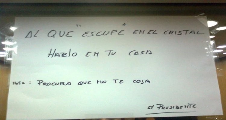 “¡Por Dios! ¿¡A quién se le ocurre escupir en el cristal!?” Es lo que todos pensamos al leer éste papel. Y es hay que ser bien cochino, y para colmo, no tener ni una pizca de decencia. Es una de las amenazas más curiosas, debido a que el presidente fue quien la escribió. Claro, el presidente del edificio, no Rajoy... que nadie se vaya a confundir.