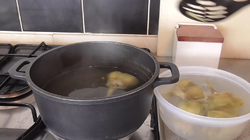 Una vez que hayan pasado los veinte minutos, clávales un cuchillo para ver si están cocidas. Como hemos dicho antes, tienen que estar un poco duras. Seguidamente, saca las alcachofas de la cazuela y sumérgelas en agua fría para cortar su cocción. Tras dejarlas unos minutos en remojo, escúrrelas. Ya están listas para ser rellenadas. Mientras se van secando, hay que ir preparando el relleno...