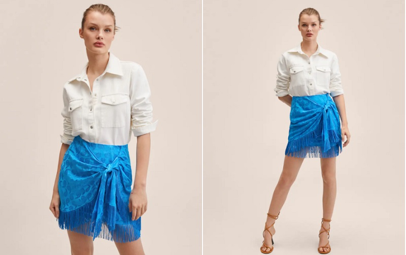 La siguiente prenda del catálogo de Mango es una minifalda de color azul. Está fabricada al 100% de viscosa y presenta un estampado paisley. Además, cuenta con flecos que le aportan dinamismo. También posee un nudo como adorno. Se pone y se quita gracias a una cremallera que está situalda en la parte posterior. Puedes comprarla por tan solo 29'99 euros.