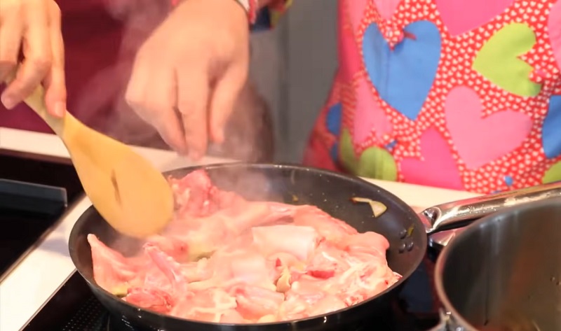Una vez que las verduras estén tiernas, retíralas de la sartén y échalas en una cazuela. Escurre el aceite para que el tomate se haga con el jugo que han soltado. Después, tienes que añadir los trozos del animal para que se doren a fuego medio. No lo pongas a máxima potencia para que no queden muy secos. Dales la vuelta para que se hagan por el otro lado. El conejo con tomate va cogiendo tono...