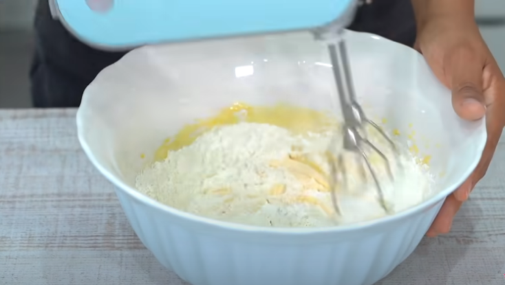 Para añadirla, coloca un colador sobre el bol y añade una parte; tamízala e incorpórala con la ayuda del batidor eléctrico apagado para evitar que la harina te salpique. Luego enciéndelo y termina de incorporar completamente.