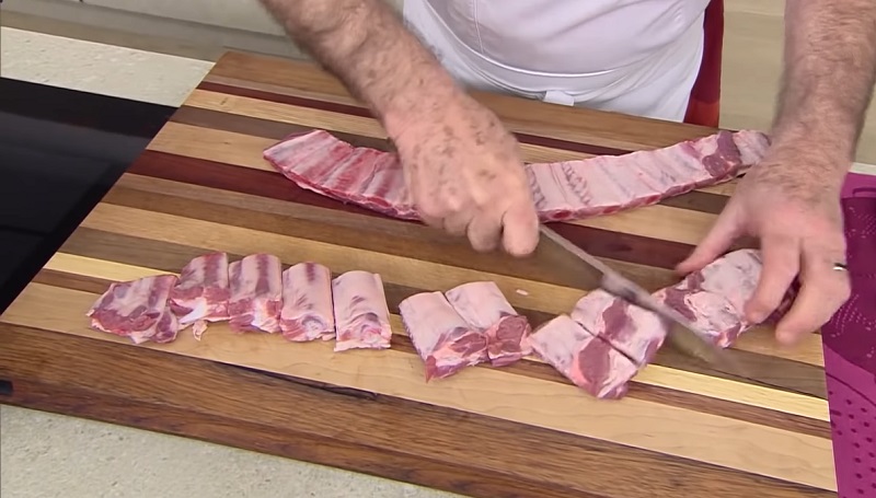 En primer lugar, tienes que cortar las costillas si has comprado la pieza entera. Realiza un corte con la ayuda de un cuchillo afilado entre hueso y hueso. Ponles una pizca de sal y pimienta por encima. Coloca la olla exprés en el fuego y échale tres cucharadas de aceite de oliva virgen extra. La carne se tiene que dorar antes de empezar a guisarse, por lo que tienes que añadirla al recipiente cuando esté caliente. Continuamos con la receta...