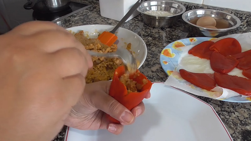 Con la ayuda de una cuchara, vete introduciendo el relleno en los pimientos del piquillo. Para que entre más cantidad, presiona un poco la mezcla para que quede más hueco. Reparte todo el relleno entre los pimientos que tengas listos para cocinar. Puedes hacerlos tal y como están o rebozarlos en harina y huevo para darle un toque crujiente. Ya solo queda el último paso de la receta...