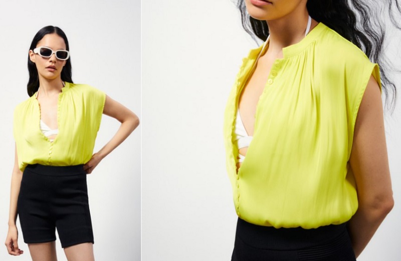 Cambiando de registro, nos encontramos con una camisa lisa no apta para superticiosos, ya que es amarilla. La prenda es de manga corta y cuenta con cuello en forma de caja. Se cierra frontalmente con un montón de botones del mismo color. Esta prenda es muy sencilla de combinar, ya que pega con prácticamente todo. Puedes comprarla en las tiendas de Sfera o en su página web por 25'99 euros.