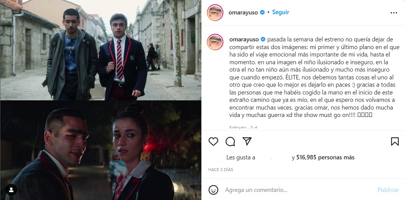 Para despedirse de su personaje, Omar Ayuso ha publicado el primer y último plano de su participación en la serie de Netflix. Además, le dedica unas palabras muy emotivas al papel que le ha dado la fama: "En una imagen, el niño ilusionado e inseguro y en la otra, el no tan niño aún más ilusionado y mucho más inseguro. Élite nos debemos tantas cosas que lo mejor es dejarlo en paces".
