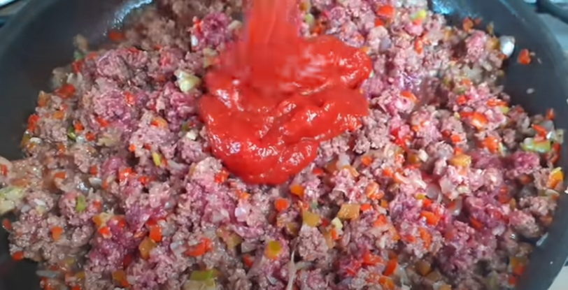 Una vez que la carne luzca sellada, añade la salsa de tomate. Puedes utilizar salsa de tomate casera o de bote, la que prefieras.