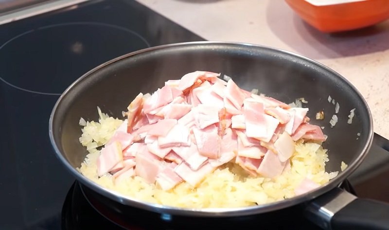 Coloca una sartén en el fuego con una cucharada de aceite de oliva. En lo que se calienta pica la cebolla y añádelela. Mientras se va a pochando, tritura la carne de las patatas con un tenedor y mézclala con un poco de mantequilla. Cuando la cebolla se haya vuelto transparente, incorpórale las lonchas de beicón troceadas. Falta el ingrediente principal de las patatas rellenas de queso...
