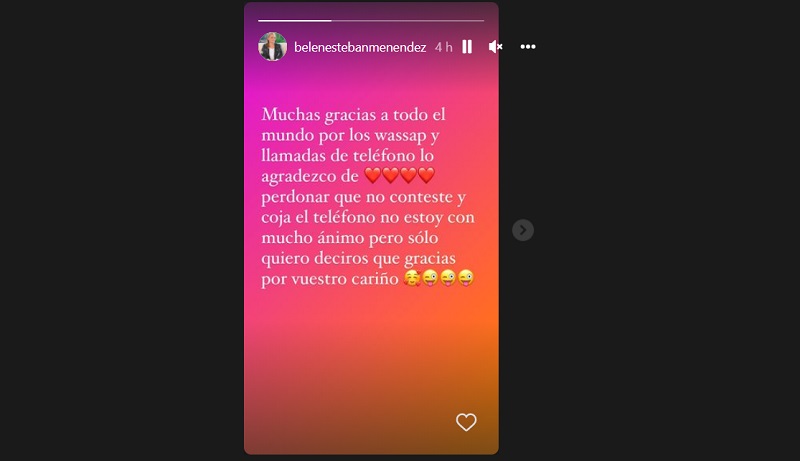 Belén Esteban ha roto su silencio a través de su cuenta de Instagram. Sin dejar verse, la colaboradora de Sálvame ha escrito unas palabras para agradecer todas las muestras de interés que ha recibido. Además, la ex de Jesulín ha reconocido que no tiene ánimos para coger el teléfono. Tenía pensado ir a la Feria de Abril de Sevilla, pero esta lesión se lo va a impedir. En unas semanas podría regresar a su trabajo...