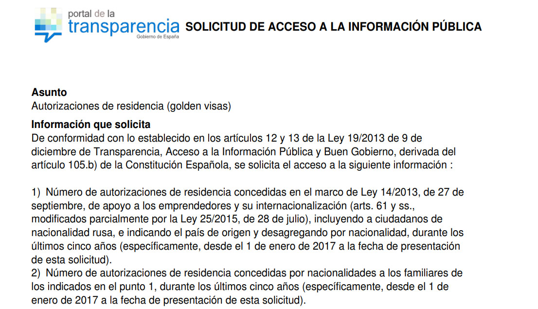 En la solicitud realizada al amparo de la Ley 19/2013 de 9 de diciembre de Transparencia, Acceso a la Información Pública y Buen Gobierno, TI-España ha instado a ambas entidades a brindar acceso a cualquier información relativa al número de autorizaciones de residencia concedidas en el marco de la Ley 14/2013, de 27 de septiembre, de apoyo a los emprendedores y su internacionalización, incluyendo a ciudadanos de nacionalidad rusa, e indicando el país de origen y desagregando por nacionalidad, durante los últimos cinco años.